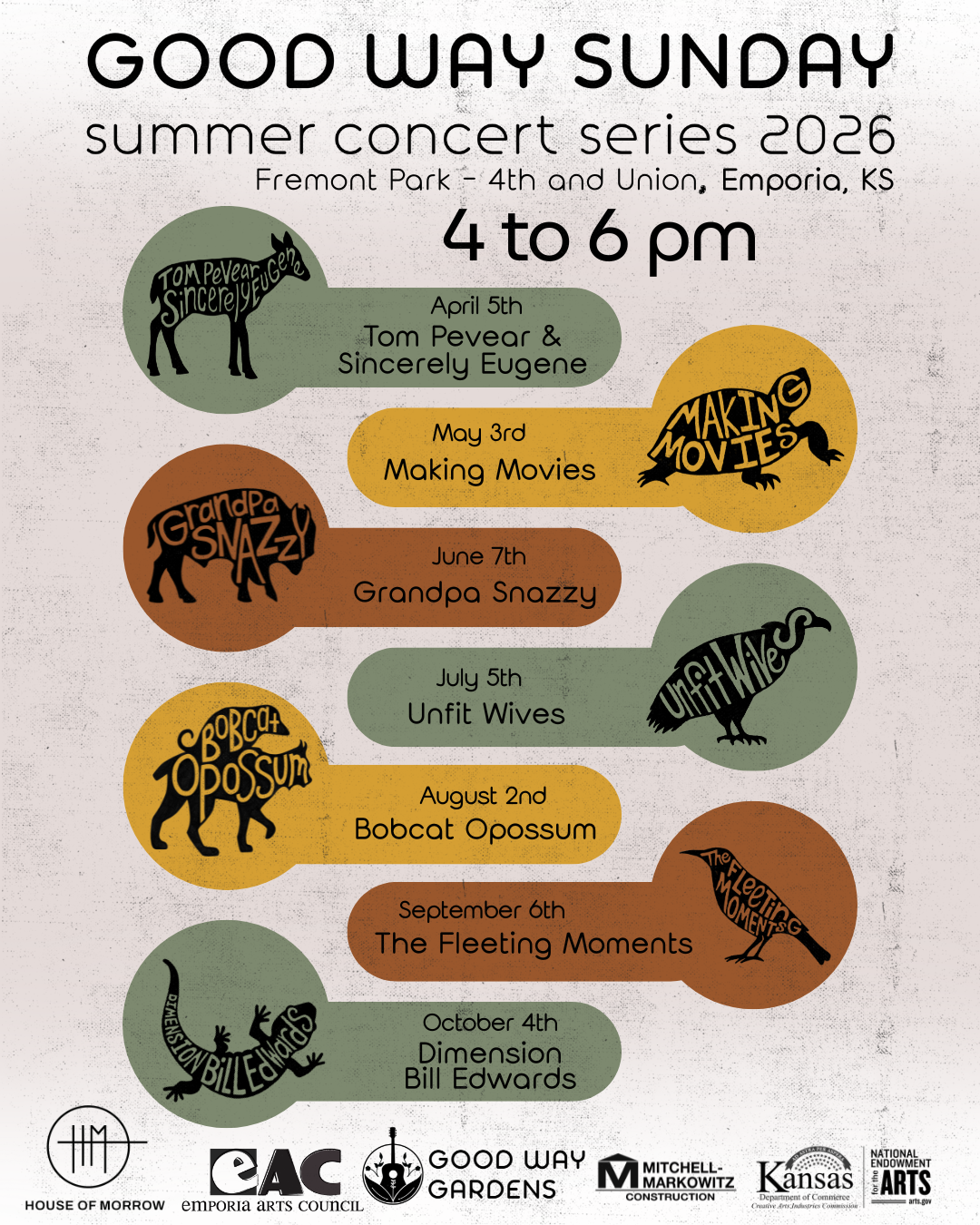 The 2026 Concert Series will be held in Fremont Park at 4th & Union in Emporia. The series is supported by Emporia Arts Council with the ArtMobile, and House of Morrow with supporting presentations. We'll also frequently be joined by Emporia Public Library, and ESU Art Therapy students. Bring chairs. Picnics are welcome!