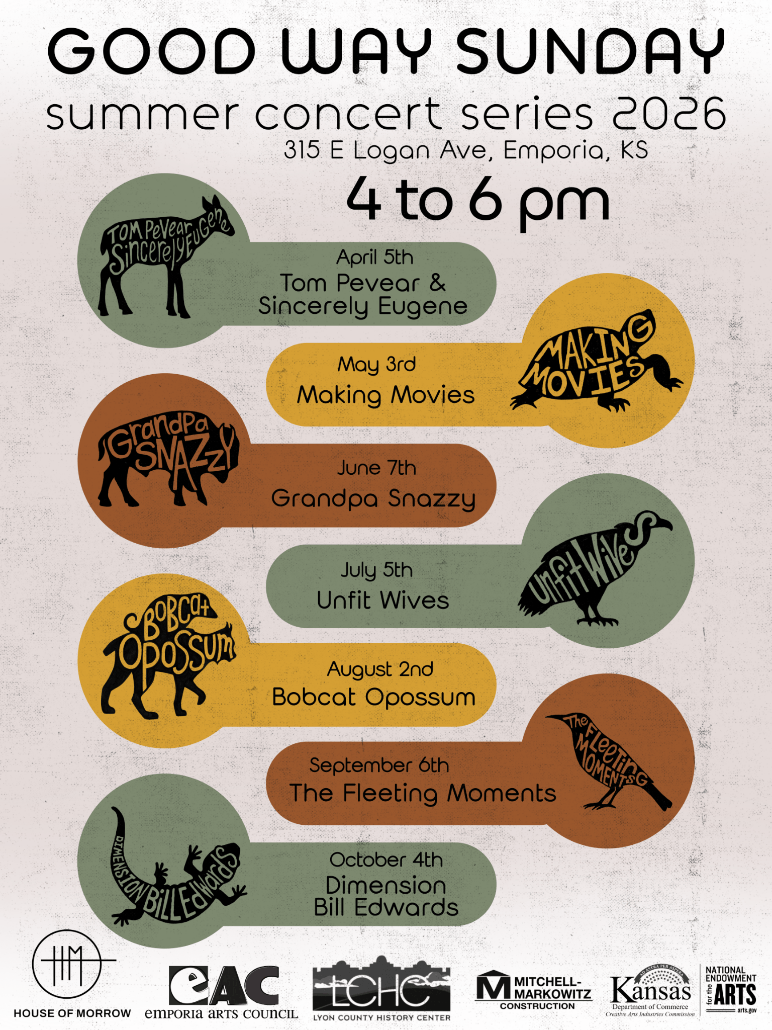 Good Way Sunday is the flagship program of Good Way Gardens and is copresented by House of Morrow and Emporia Arts Council. Through a partnership with the Lyon County History Center, free family-friendly monthly concerts are presented at the Richard Howe House at 315 E. Logan Ave. in Emporia, Kansas. Local art partners and garden activities contribute to a sustainable festival atmosphere. Bring chairs. Picnics are welcome, alcohol is not permitted.